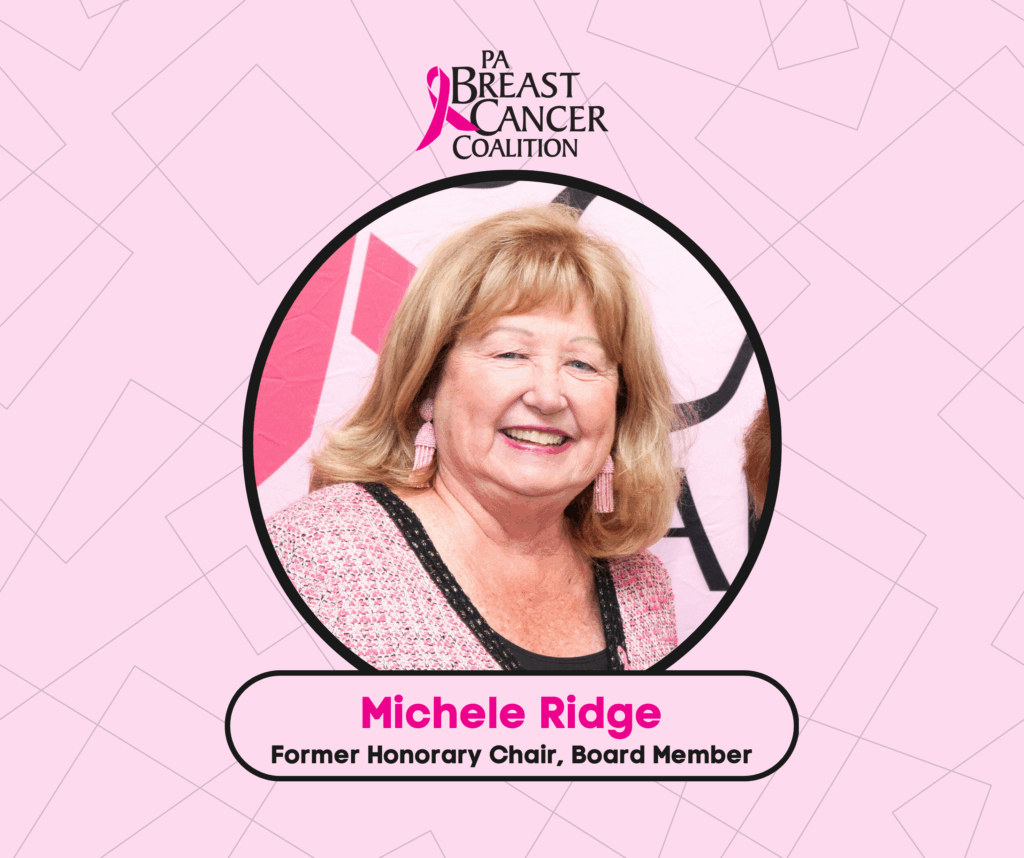 As First Lady of Pennsylvania from 1995-2001, Michele Ridge served as Honorary Chair and played a pivotal role in shaping the PA Breast Cancer Coalition into what it is today.
